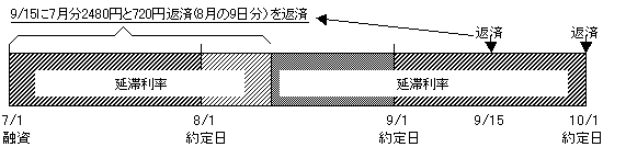 → 約定日8/1より遅れたので、この時に払った3200円はすべて延滞利率で計算。